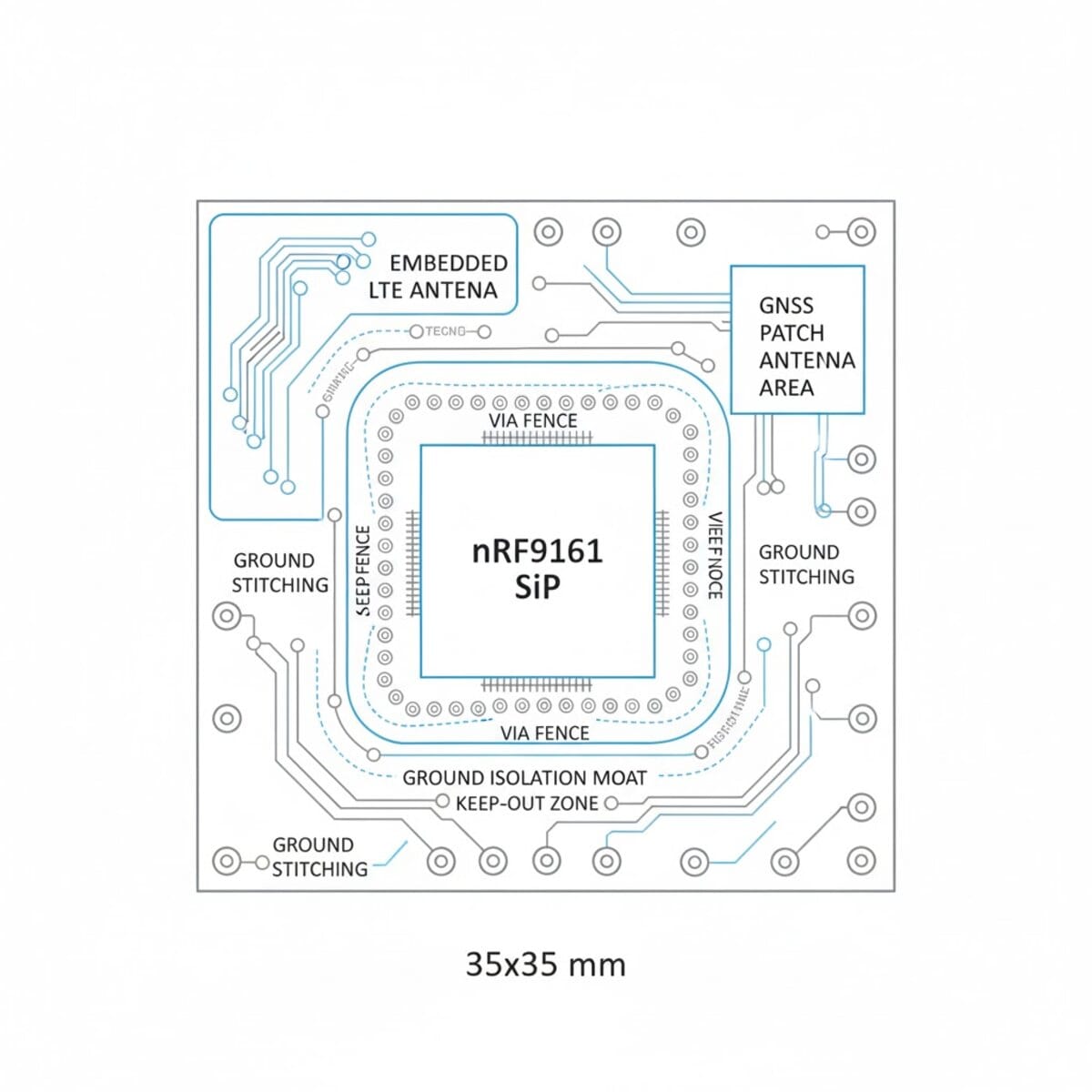 The nRF9161 SiP is wonderfully integrated, but it does not remove the need for careful RF design. In a 35 mm square you cannot make the antennas an afterthought. We chose an embedded LTE antenna tuned for our bands and a patch‑style GNSS element. Between them we cut a ground isolation moat and stitched vias to stop the LTE feed coupling into the GNSS trace. We also used a small discrete LNA and SAW filter on the GNSS front end; this is not strictly required by the SiP but it gives margin when plastic or adhesive detune the patch or when the modem's harmonics are high during attach.