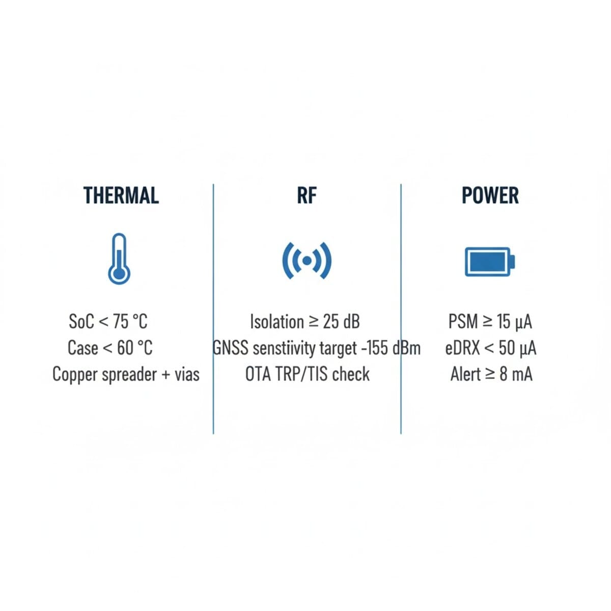 The tables in the specification are not decorative; they are contracts. The thermal table says the module shall not exceed 75 °C under a ten‑minute continuous uplink at 45 °C ambient, and the case shall remain under 60 °C. The RF table demands at least 25 dB isolation between the LTE and GNSS feeds, a GNSS sensitivity around −155 dBm, and OTA radiated efficiency that meets regulatory requirements. The power table states that PSM current is roughly 15 µA, hourly eDRX around 50 µA and minute‑level tracking around 8 mA. When an engineer proposes a material or layout change, these numbers tell us what to re‑measure.